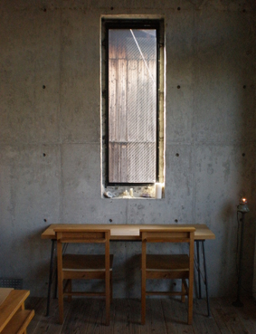 打ちっぱなしの壁にシンプルなテーブル。