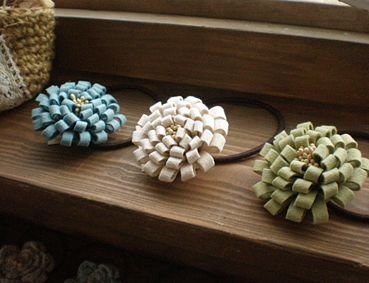 前回納品したスエードのゴムの新色や、定番の手編みヘアゴム。