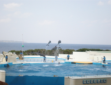 沖縄音楽に合わせて「キューキュー」鳴くイルカがかわいい。