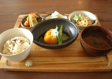 おにぎりは、ルクルーゼで炊いた玄米に、
