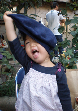 mamaの帽子で遊んでおちゃめな表情のmoiちゃん。