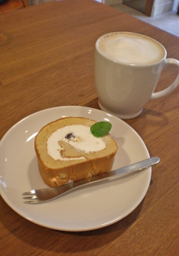 もちもちしっとりの優しい甘みのロールケーキとソイラテ。