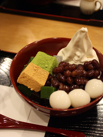 豆乳のソフトクリームがおいしい特製あんみつ。