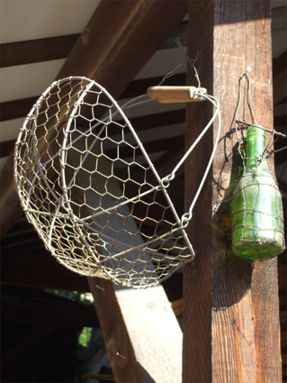 柱に引っ掛けられたカゴとビン。