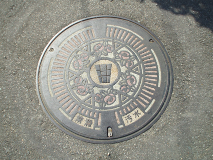 常滑のマークと市の花「サザンカ」模様のマンホール。