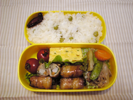 ・ごはんを炊く時に塩を少々とエンドウの豆を入れて炊く。