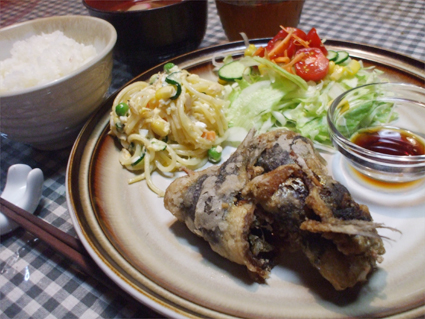 ・豚肉でごぼう、にんじん、長芋、大葉を巻いて焼く。
