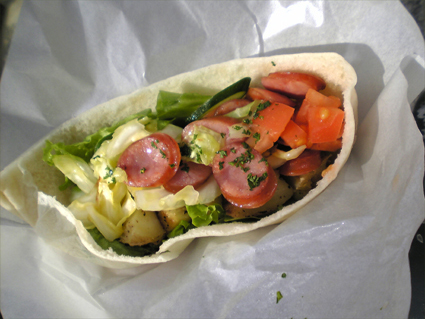 ガーリックで炒めたポテト、トマト、チリソーセージ、マヨネーズ入り。