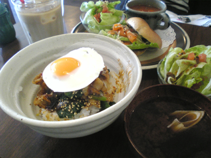ビビンバ丼とサラダとお味噌汁にドリンク。