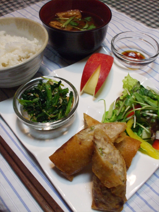 春巻きの皮にあんをのせて巻き、油で揚げる。