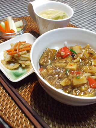 油が透明になってきたら、筍、しめじを入れ、火を通し、茄子も加える。