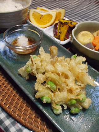 枝豆と玉ねぎ、小えび、天ぷら粉を入れて混ぜ、
