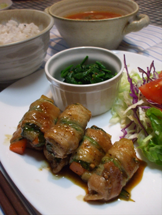 豚バラ肉に柚子コショウを少しぬり、小松菜、長芋、にんじんをのせて巻く。