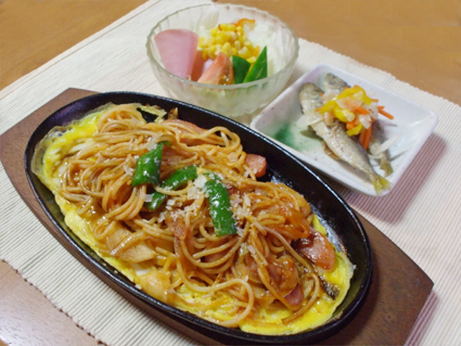 しっかり温めた鉄板に溶き卵を流し入れスパゲッティをのせる。