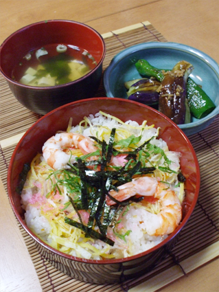 錦糸卵、でんぶ、ボイルした海老、大葉の千切り、