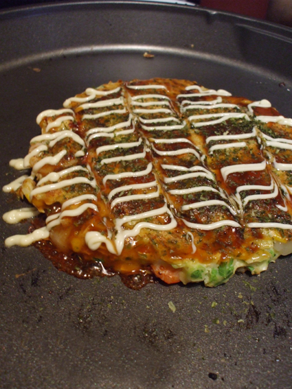 両面を焼いたらソースとマヨネーズ、青のりをかける。