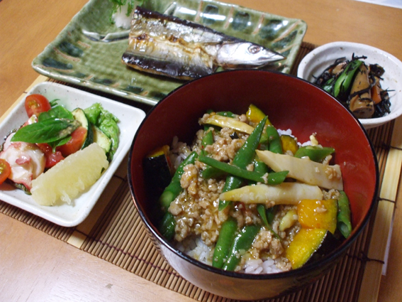 ●インゲンとカボチャのピリ辛丼