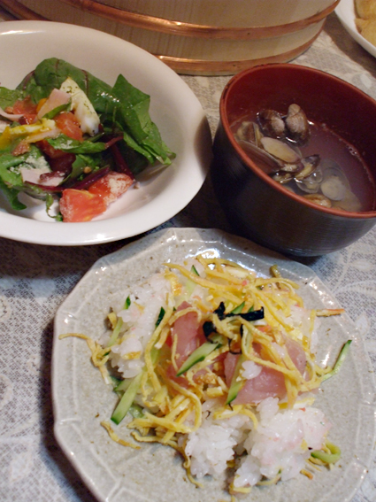 ・ちらし寿司はきゅうり、錦糸卵、まぐろ、でんぶ、海苔とシンプルなもの。