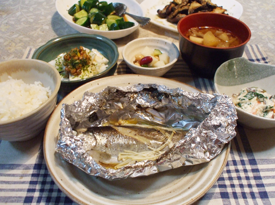 ・下ごしらえをしたにじますをホイルに入れ、きのこ類、